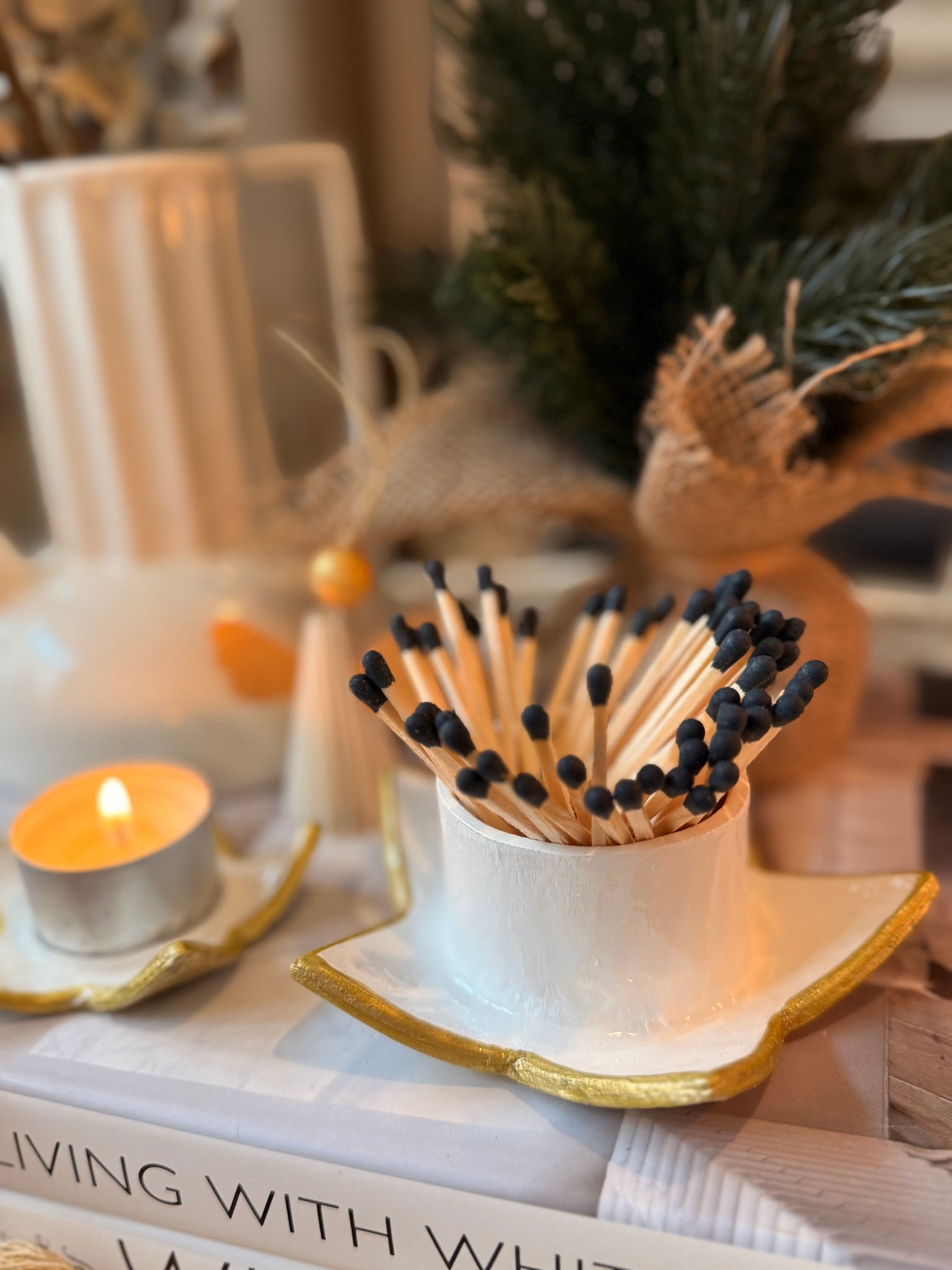 Finished with a touch of gold gilding wax along the rim, these holders add a subtle shimmer that catches the candlelight perfectly. Ideal for creating a cozy, natural look on your dining table, mantel, or coffee table display.