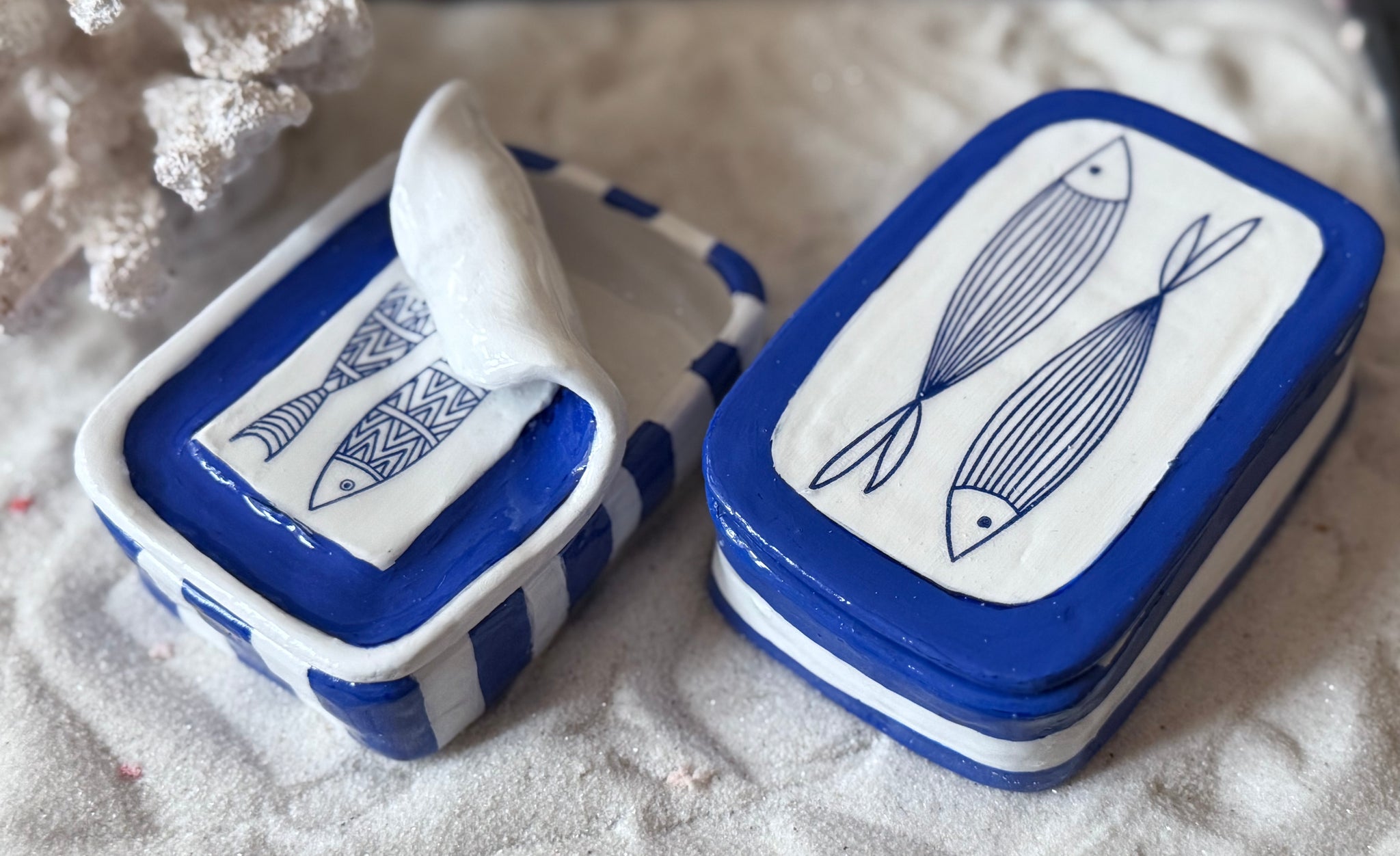 Bring a touch of coastal living into your home with this handmade sardine trinket box, perfect for storing jewellery, keepsakes, or small treasures. Each box is uniquely crafted by hand, making no two exactly the same. Its quirky sardine design adds seaside charm and makes it a delightful piece of coastal decor or a thoughtful gift for ocean lovers.